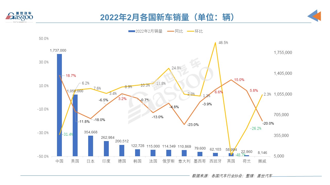 2月份,全球车市还未从疫情和芯片短缺等不利因素中摆脱,又迎来了俄乌局势的升级,这对汽车行业供应链来说可谓是雪上加霜。在此背景下,全球车市的表现自然是景气不了。