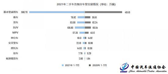 1-7月,二手车交易989.33万辆,同比增长45.96%,比2019年同期增长22.52%。其中,基本型乘用车共交易598.78万辆,同比增长49.28%;客车76.92万辆,同比增长30.16%;载货车83.08万辆,同比增长33.49%;SUV 106.90万辆,同比增长63.11%;MPV 57.35万辆,同比增长42.94%;交叉型乘用车22.18万辆,同比增长30.79%。各车型同比均有明显增长。