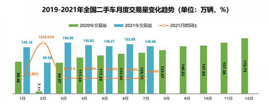 再来看二手车,今年7月,全国二手车市场交易145.90万辆,同比增长15.66%,环比下降4.45%,交易金额为912.20亿元。