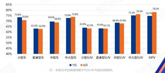 1-7月,二手车交易989.33万辆,同比增长45.96%,比2019年同期增长22.52%。8月各级别二手车型保值率基本处于上涨趋势,但中大型车价上涨幅度做大,而小型车、紧凑型车价略有下降。