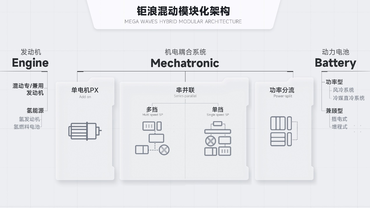 在减碳方面,混合动力科技是不可忽视的力量。广汽集团以打造中国最强混动系统为目标,于2022年4月发布了全新的混动技术品牌——钜浪混动,并在本次广汽科技日正式发布了钜浪混动的技术支撑——钜浪混动模块化架构,以体系化的技术革新,带来智能化和电气化的历史性跨越。该架构由混动发动机(E)、机电耦合系统(M)和动力电池(B)三大部分构成,采用平台化、模块化设计,兼容性强、通用性高,可衍生出4大类别和N个动总组合,完美适配所有HEV、PHEV和REEV等XEV车型。