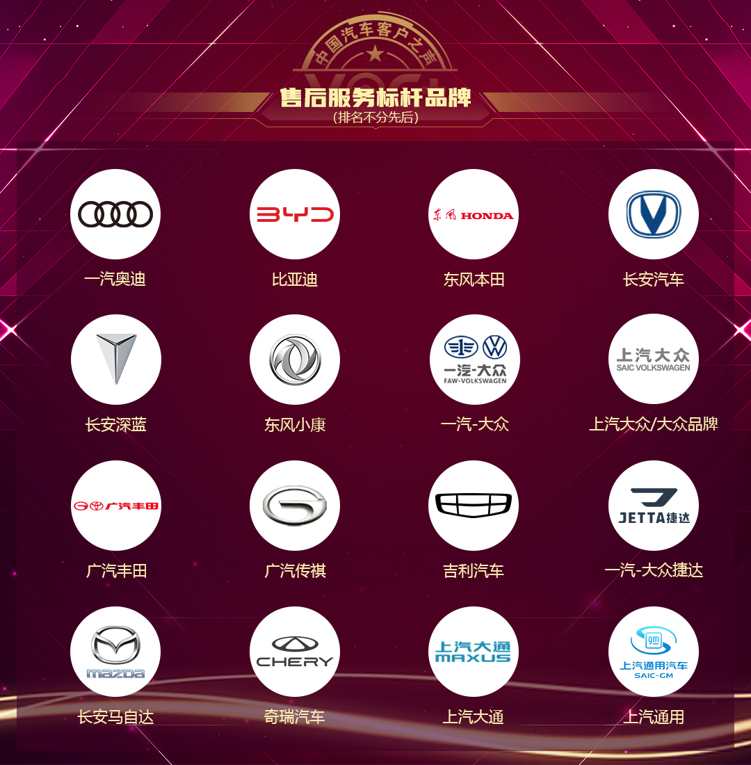 售后服务标杆品牌的获得者有(排名不分先后):一汽奥迪、比亚迪、东风本田、长安汽车、长安深蓝、东风小康、一汽-大众、上汽大众/大众品牌、广汽丰田、广汽传祺、吉利汽车、一汽-大众捷达、长安马自达、奇瑞汽车、上汽大通、上汽通用。