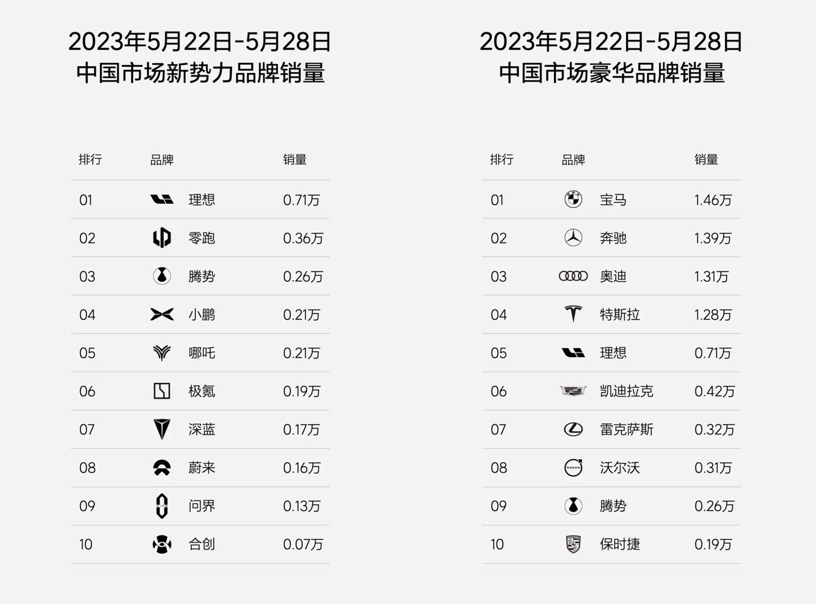 结合此前数据,上一周(5.15-5.21),理想汽车周销量亦达到0.71万辆,领先其他中国市场新势力品牌。该周,理想汽车位居中国市场豪华品牌销量前五名,排位在其之上的同样是宝马、奔驰、奥迪与特斯拉。