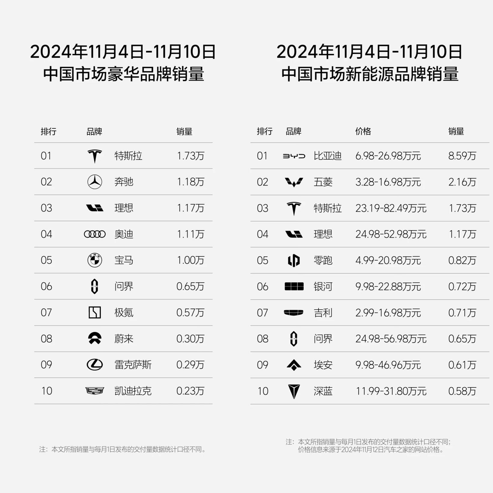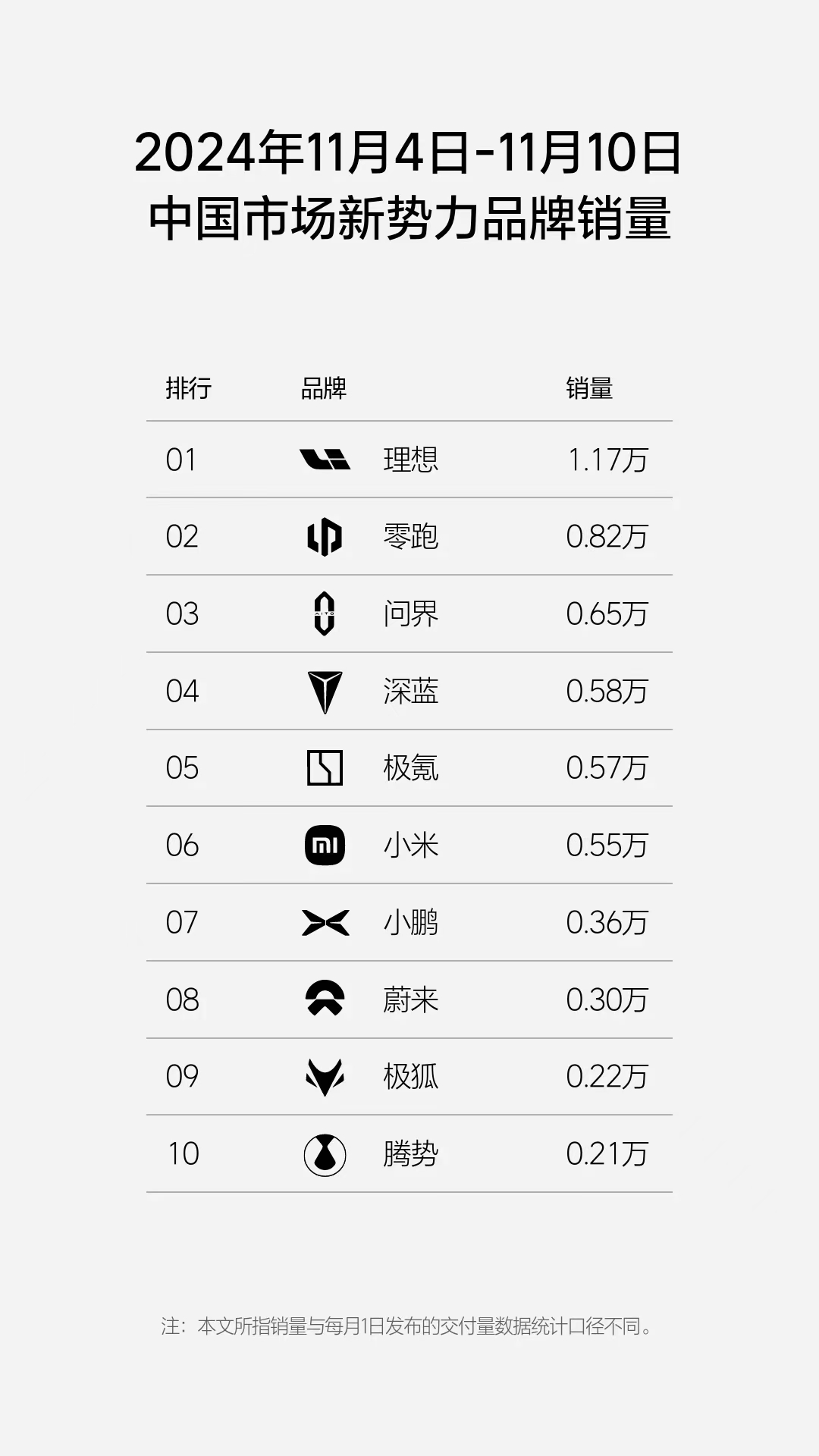 11月12日,理想汽车发布了2024年第45周(11月4日-11月10日)的销量榜。