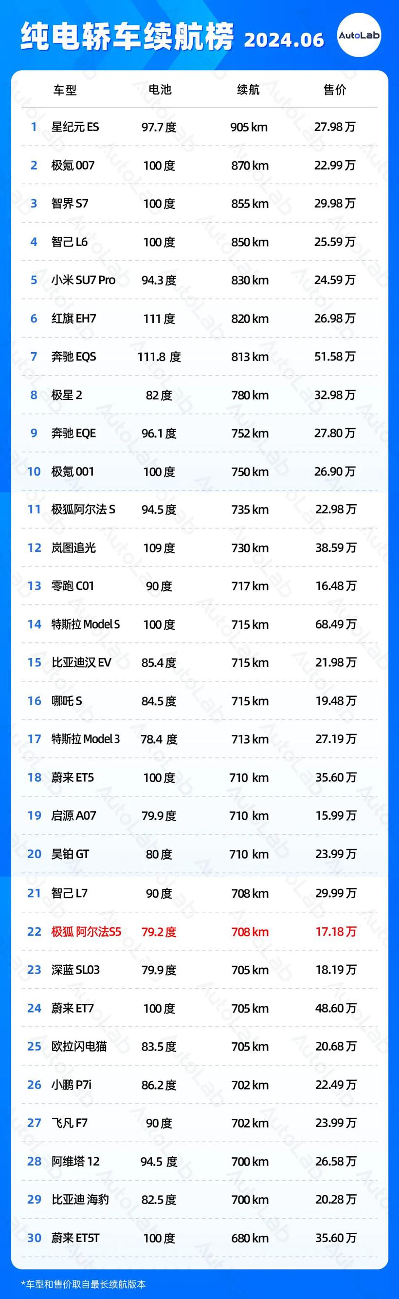 纯电轿车榜单中,本月只新增了极狐阿尔法S5一款新车,售价只有17.18万元,而且是搭载了800V高压平台的车型。