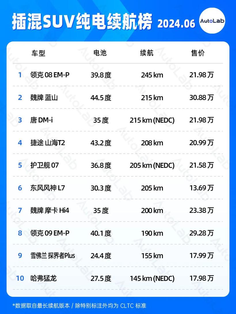 6月份的续航榜如期而至,为了让榜单更具参考性,我们把纯电续航榜分成了轿车、SUV、MPV三大类,另外还新增了增程SUV、插混SUV、插混轿车的细分榜单,供大家参考。