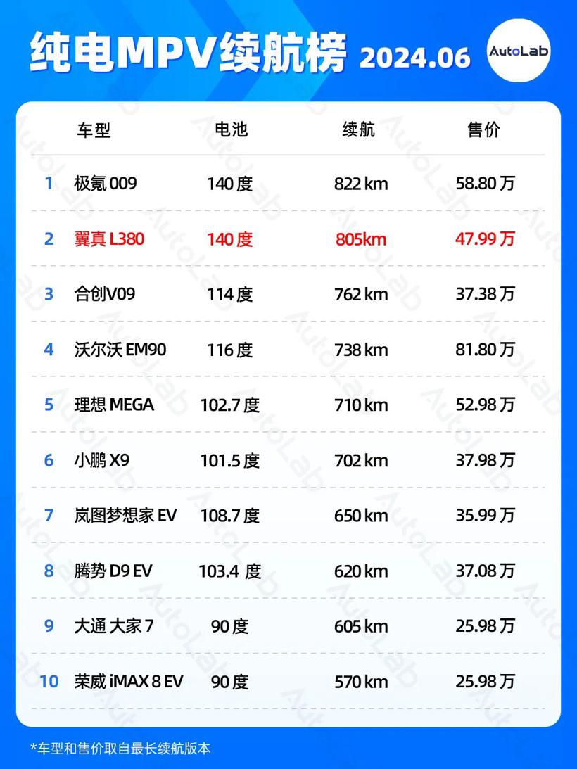 本月榜单新增的一款纯电MPV是吉利旗下的翼真L380,这款MPV的性价比其实非常高,售价比009便宜10万出头,但却搭载了009同款的140度超大电池,续航可达805km,而且还有8座布局,非常适合商务场景。