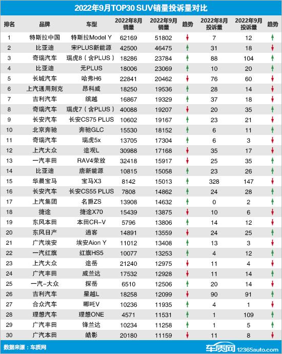 9月份的SUV车型的质量问题中,“漆面起泡开裂”投诉量再次出现激增,投诉量突破千宗,环比涨幅达1.5倍,投诉依旧集中在部分自主品牌热销车型。此外,“车身生锈”本月投诉量也出现明显增长,较8月份上涨36.7%,排名升至第三位。在服务问题中,“与宣传不符”投诉量较上月出现大幅回落,但仍保持着过千宗的体量,排名第一位。值得注意的是,“隐瞒相关信息”本月投诉量环比暴涨约5.7倍,投诉绝大部分集中在理想ONE车型。去除投诉人自愿申请撤诉的信息后,2022年9月TOP30 SUV销量投诉量排名如下: