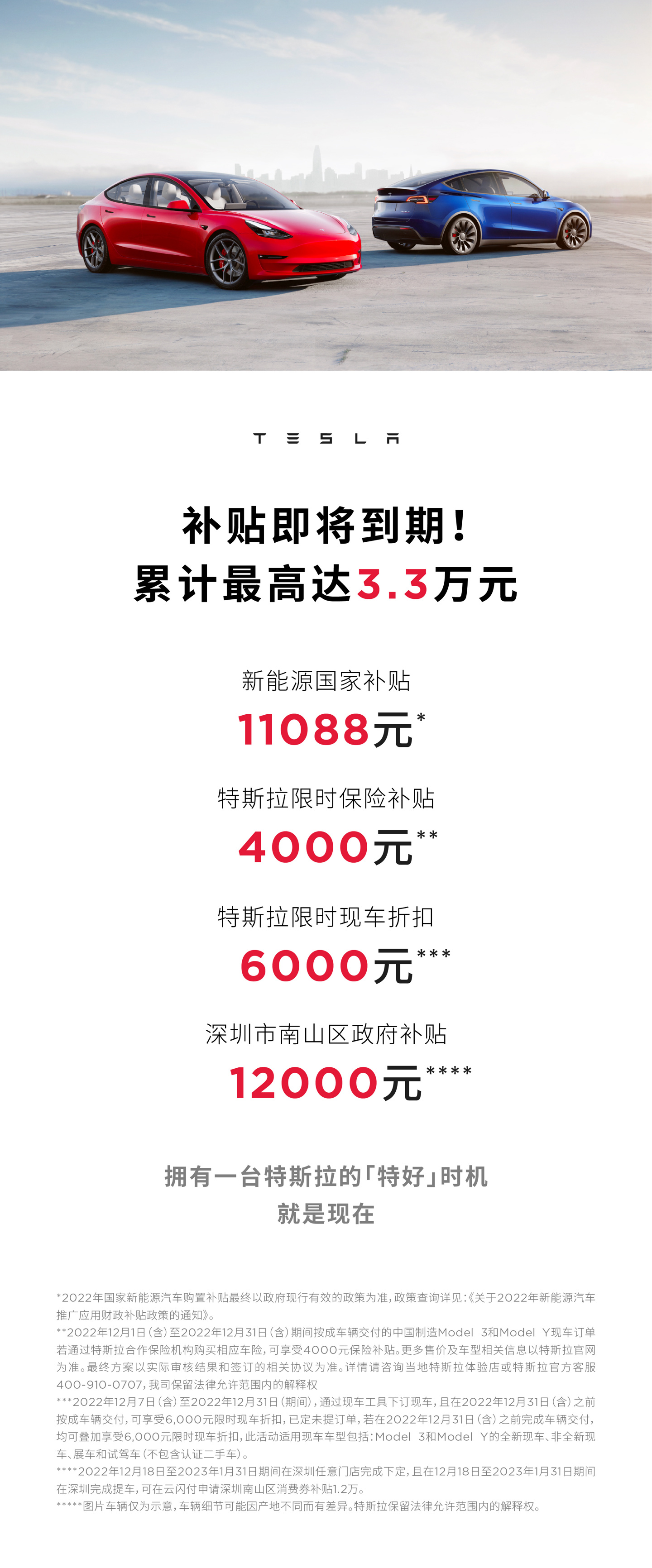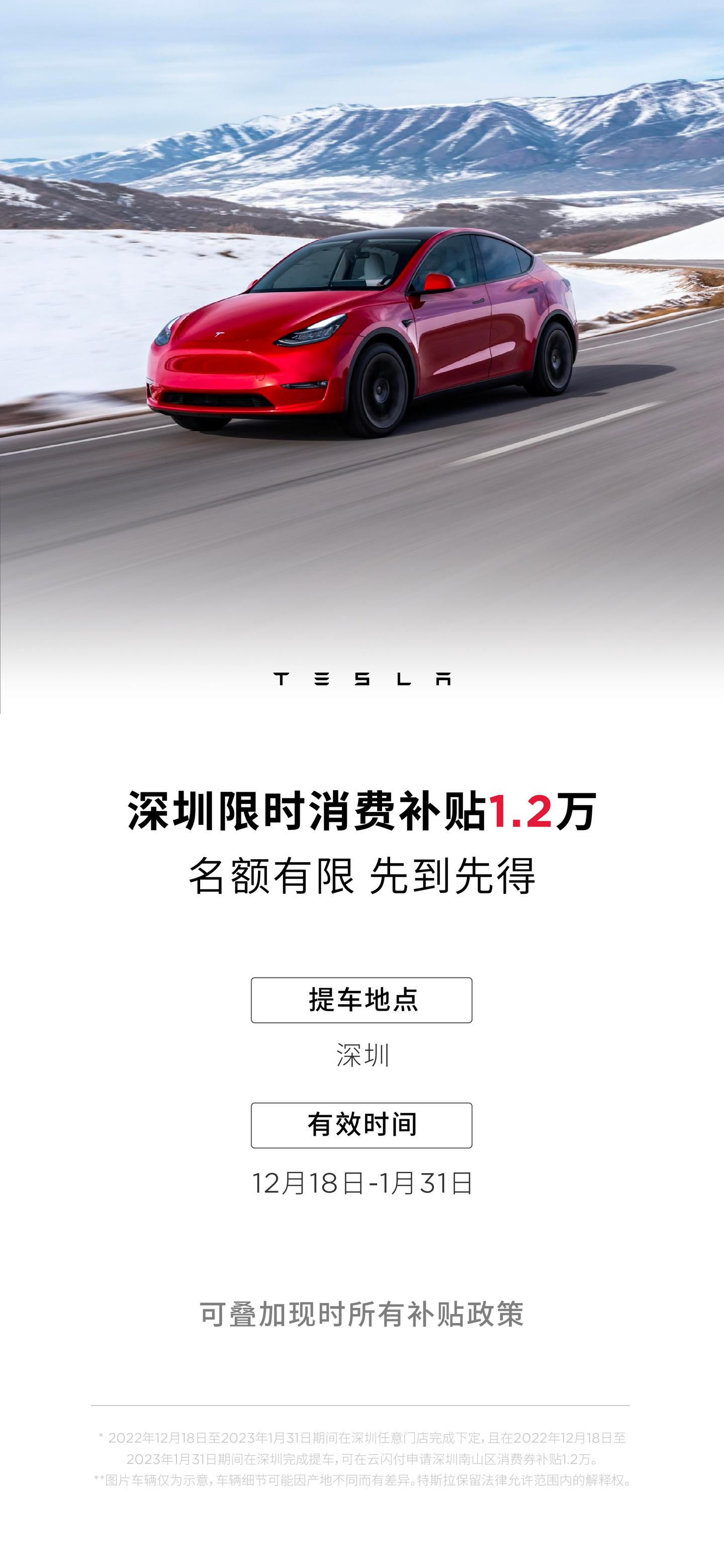 2022年国家新能源补贴即将结束,近日,特斯拉又官宣,旗下的Model 3 RWD 和 Model Y RWD获得了深圳临时补贴,在2022年12月18日至2023年1月31日期间于深圳任意门店完成下定并提车,可申请深圳南山区消费券补贴1.2万。