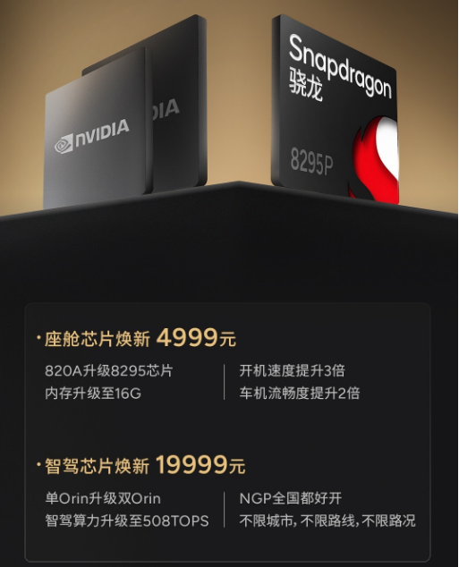 座舱芯片焕新4999元:820A升级8295芯片,内存升级至16GB。智驾芯片焕新19999元:单Orin升级双Orin,智驾算力升级至508TOPS。
