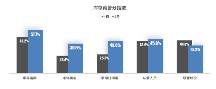 从分指数情况看,2月市场需求、平均日销量、从业人员指数环比上升,但经营状况指数环比下降。本次调查中,80.2%经销商认为2月销量未达预期。
