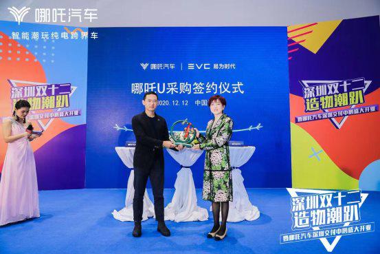 活动当天,哪吒汽车营销公司副总裁黄玉贵先生与易为时代执行董事、联合创始人、首席运营官尹伊进行了哪吒U首批100台大客户签约仪式。