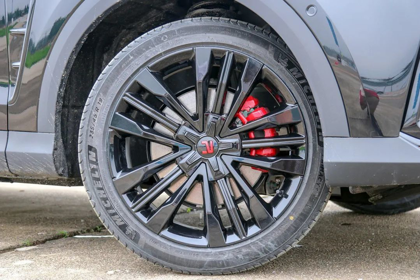 内部有强大的性能,外观上必须也得显露一番。MARVEL R配备了19英寸的黑色涂装双五辐镂空造型轮圈,再搭配上内部的红色刹车卡钳,运动感营造的十分到位。