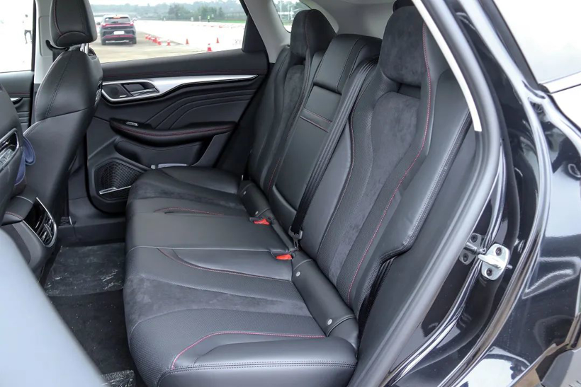 MARVEL R的后排座椅也与前排座椅一样采用了一体式头枕设计,搭配上Alcantra材质和真皮材质两种材质的拼接,以及红色缝线的点缀,车内的运动氛围变得更加浓郁。看上去十分运动的座椅,其实乘坐起来还是以舒适性为主,后排座椅的座垫长度和高度都比较适中,填充物也比较厚实,既能提供一定的支撑,也不会过硬影响舒适。