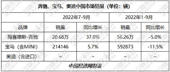 作为高档车市场的风向标,宝马和奔驰三季度同样实现正增长。数据显示,三季度,宝马累计销售21.42万辆,同比增长5.7%;奔驰销售20.68万辆,同比增长37%。截至记者发稿前,奥迪尚未发布销量信息。