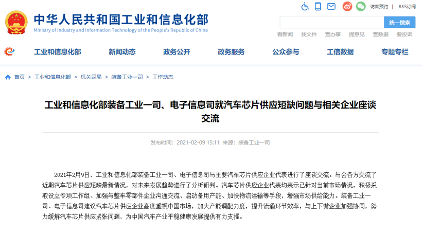 昨日,工业和信息化部官方网站发布消息称,工信部装备工业一司、电子信息司与主要汽车芯片供应企业代表进行了座谈交流。装备工业一司、电子信息司建议,汽车芯片供应企业高度重视中国市场,加大产能调配力度,提升流通环节效率,与上下游企业加强协同,努力缓解汽车芯片供应紧张问题,为中国汽车产业平稳健康发展提供有力支撑。