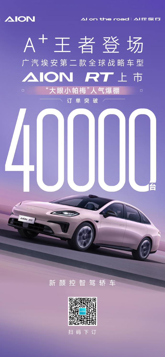 11月8日消息,从广汽埃安官方处获悉,旗下的新车型AION RT的订单量已突破40000台。