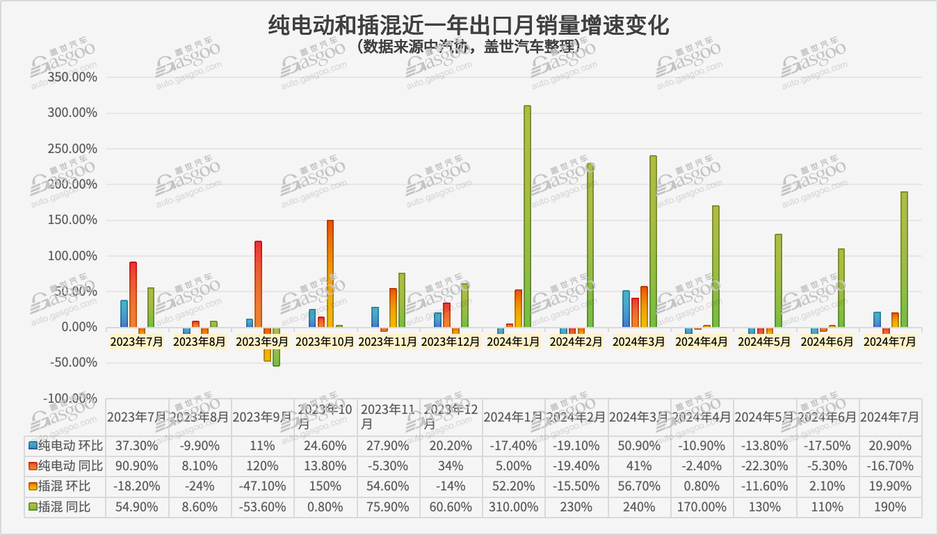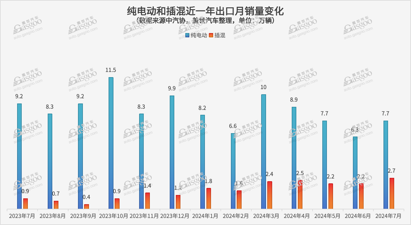 新能源汽车前7个月的整体出口仍保持双位数增长,主要得益于插电式混合动力(插混)车型的强劲表现。7月份,插混出口量达2.7万辆,同比增长1.9倍;前7个月累计出口量为15.4万辆,同比增长1.8倍。