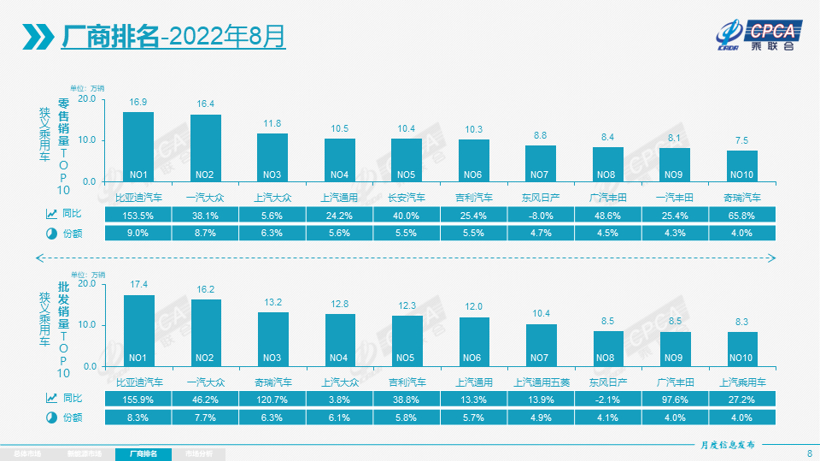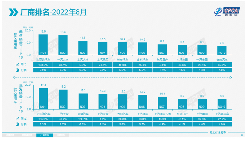 特别值得一提的是比亚迪,自4月首次登顶乘用车车企销量TOP 10,8月份再回榜首,以16.9万辆的成绩位居第一。紧随其后的依次是一汽-大众、上汽大众、上汽通用、长安汽车、吉利汽车、东风日产、广汽丰田、一汽丰田和奇瑞汽车,8月狭义乘用车零售销量分别为:16.4万辆、11.8万辆、10.5万辆、10.4万辆、10.3万辆、8.8万辆、8.4万辆、8.1万辆、7.5万辆。