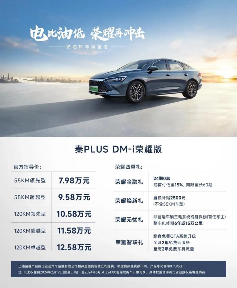 驱逐舰05荣耀版则全系为DM-i版本,7.98-12.88万元的售价包括了6款车型,同样提供55km或120km纯电续航,也在一些基本参数上也与秦PLUS荣耀版相同。