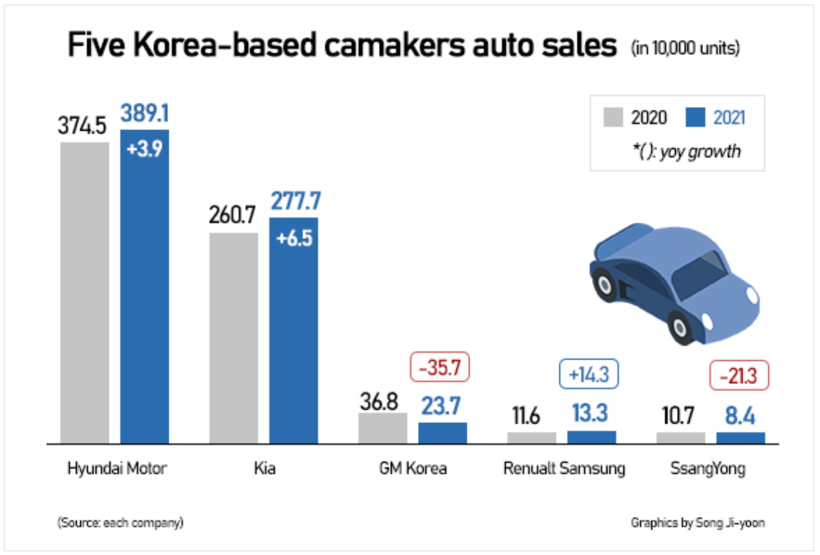 根据韩国五大车企1月3日发布的数据,2021年,现代汽车、起亚汽车、韩国通用汽车、雷诺三星汽车和双龙汽车这五大车企在全球的销量为7,430,465辆汽车,同比增长2%。其中,这五大车企在韩国的销量为1,433,605辆,同比减少10.8%,在海外销量为5,996,860辆,同比增加5.62%。