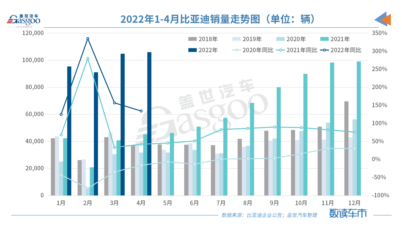 2022年5月3日晚间,比亚迪股份正式公布其最新销量数据公告。数据显示,其4月新车销量为106,042辆,同比增长134.43%。至此,2022年前四个月比亚迪累计销售新车397,420辆,同比增长166.05%。