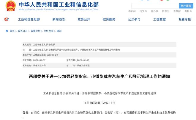 日前,工业和信息化部、公安部联合发布了《关于进一步加强轻型货车小微型载客汽车生产和登记管理的通知》(以下简称《通知》)。