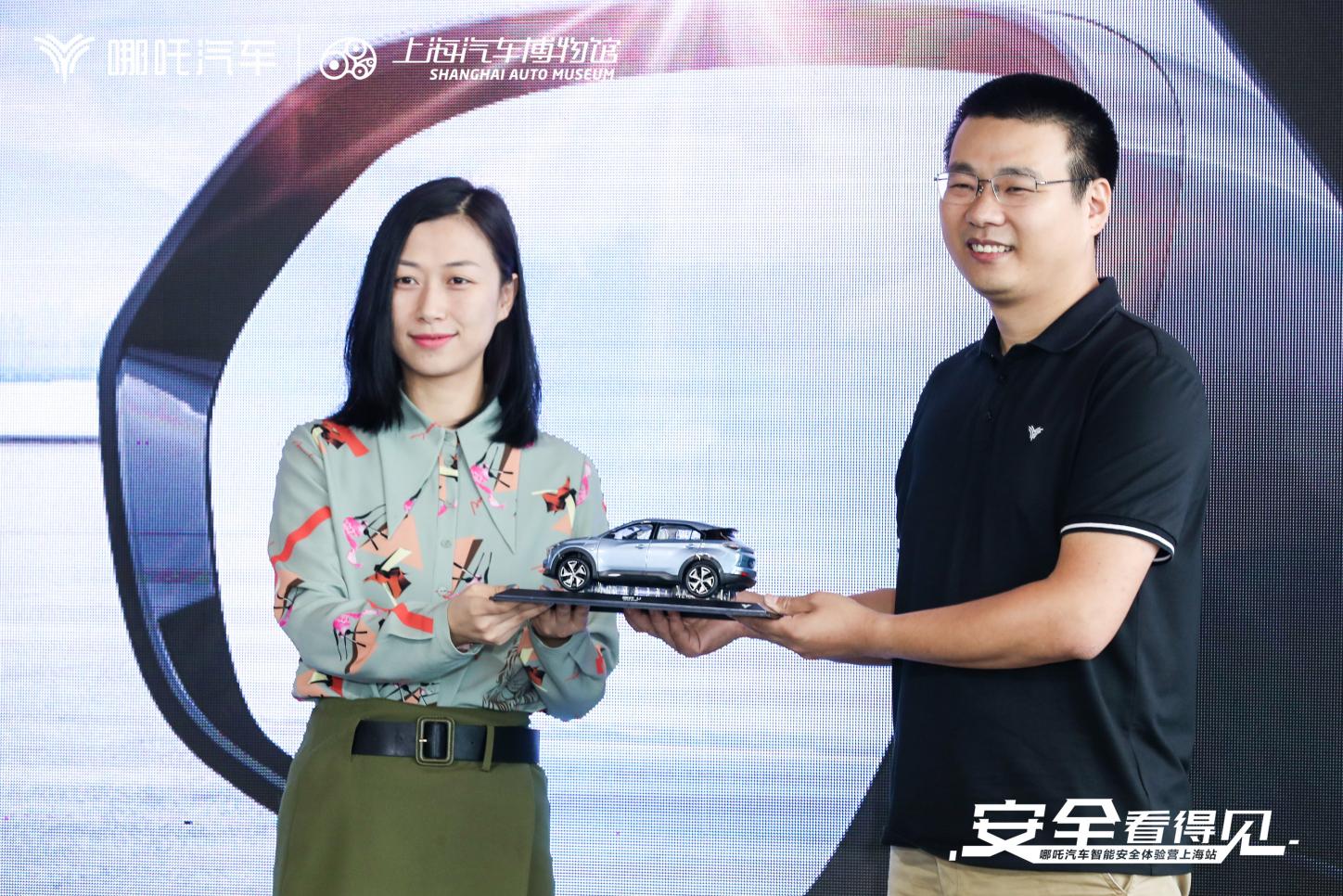 上海汽车博物馆媒体负责人章姗迟女士为活动发表欢迎辞,她表示,博物馆每年都会推出各类主题探馆活动与公益探究课程,每年都会开放很多公益课程学习机会,希望通过此次“智能安全”为主题的亲子体验课程,可以让小朋友们更多地了解汽车文化和历史,化身“小小汽车智能安全体验官”,激发孩子们的无穷创意。哪吒汽车公关传播中心副总经理陈尹斌向上海汽车博物馆公众教育部主任姚畅赠予哪吒U的车模,以感谢博物馆对活动的大力支持。