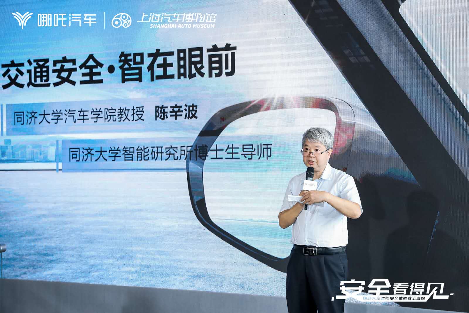 现场同济大学汽车学院教授、智能研究所博导陈辛波讲授专业的汽车安全科普知识。陈辛波教授表示,世界第一起交通事故的例子就是由于转向系统失灵导致。如今儿童座椅接口、头枕、安全带、安全气囊等装备都成为汽车安全标配。例如哪吒U的“透明”A柱、车内生命体征监测、小You智能机器人等主动安全技术,也将让汽车更加安全。